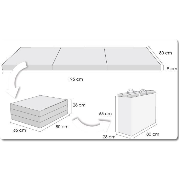 Ce matelas pliant Beautissu Campix, c'est la solution maline pour gagner de la place ! Il se plie en 3 ou 4 parties et se range facilement dans un placard ou un coffre de voiture. En le dépliant, tu as un vrai matelas de 7 à 10 cm d'épaisseur (selon la taille choisie) en mousse polyuréthane de densité moyenne, confortable et respirante.