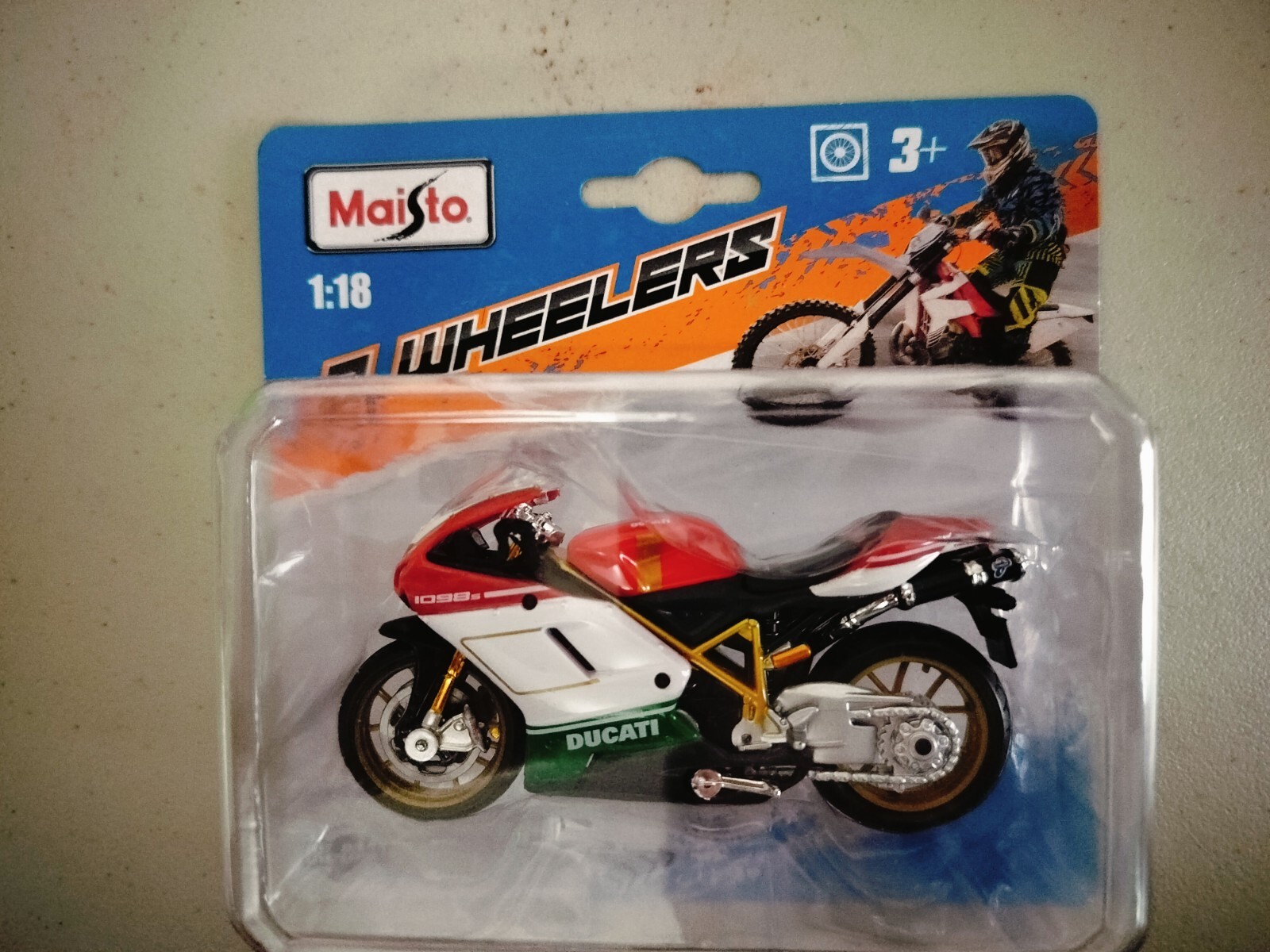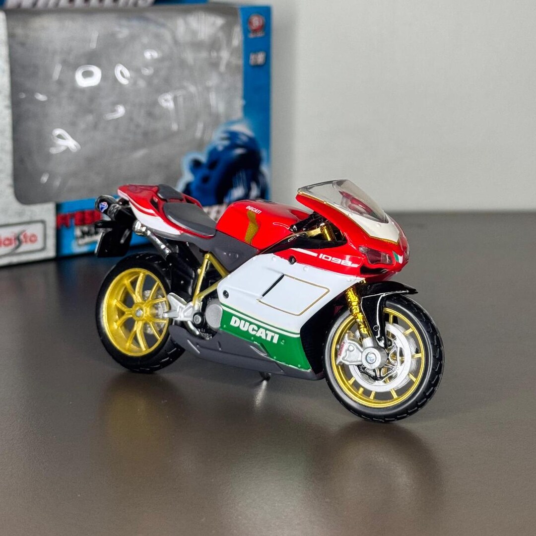 Fan de motos italiennes ? Ce modèle réduit de la Ducati 1098S va vous plaire ! Échelle 1:18, il est suffisamment grand (environ 25 cm de long) pour admirer tous les détails. Il est en die-cast (métal moulé) pour une sensation de poids et de qualité, avec des parties en plastique. La reproduction est fidèle : carénage, moteur, suspensions, roues, tout y est. Il est vendu neuf, dans sa boîte cartonnée originale scellée, et il comprend un support de présentation pour l'exposer. Marque Maisto, connue pour ses modèles de voitures et motos à prix abordables. Référence MPN : 07024. C'est un super cadeau pour un motard, un adolescent passionné de mécanique, ou pour vous-même pour décorer votre bureau ou votre vitrine. Convient aux enfants à partir de 3 ans (sous surveillance à cause des petites pièces). Ce n'est pas un jouet à manipuler brutalement, c'est plutôt un objet de collection et de décoration. Une belle façon d'avoir une Ducati super sportive sans se ruiner !