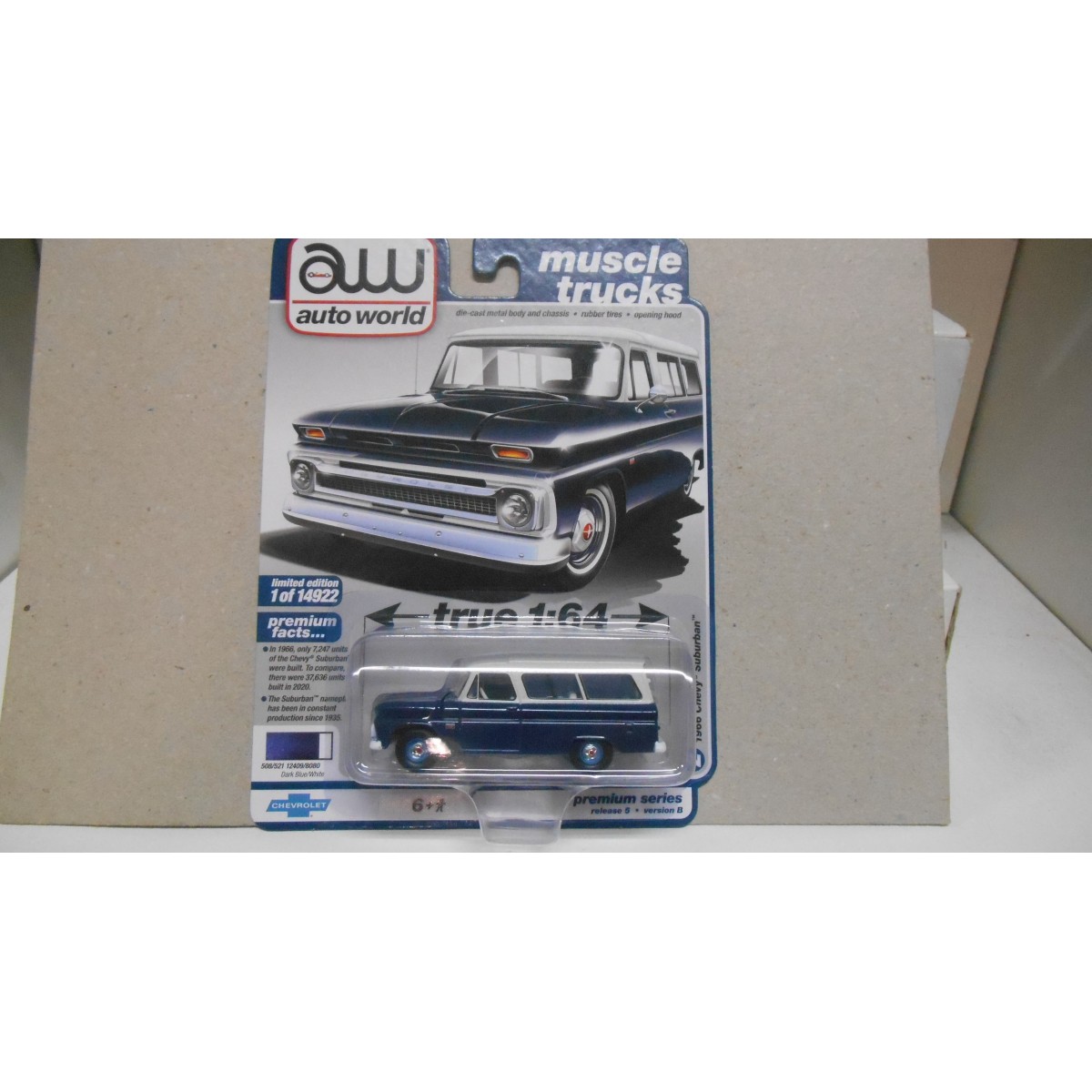 Salut les collectionneurs de miniatures ! Je vous propose ce magnifique modèle réduit de Chevrolet Suburban de l'année 1966, à l'échelle 1:64, fabriqué par Auto World (référence AW64342). Il est peint dans une superbe combinaison de couleurs bleu foncé et blanc, typique de l'époque. C'est un modèle de présentation (standmodell), donc parfait pour exposer sur votre étagère, dans une vitrine ou pour compléter votre collection de voitures américaines classiques. Le modèle est neuf et dans son emballage d'origine, bien que la boîte puisse présenter de légères traces de stockage ou de transport – rien de grave, le contenu est intact. L'EAN est 8493980495256. Que vous soyez un passionné de vieilles voitures, un amateur de modélisme ou que vous cherchiez un cadeau original pour un fan de Chevrolet, cette miniature détaillée fera certainement plaisir. Envoi soigné, prêt à rejoindre votre collection !