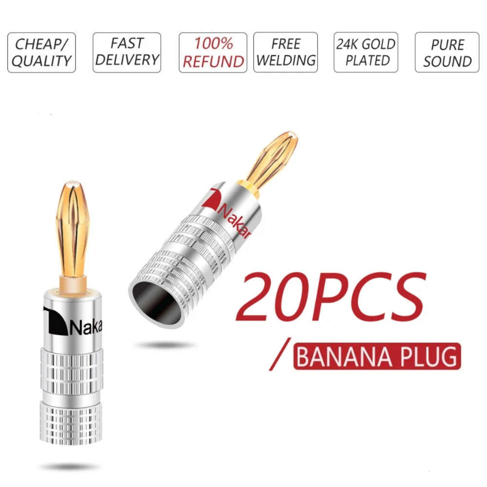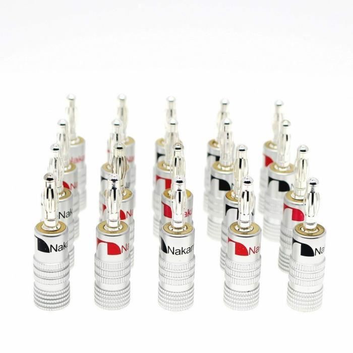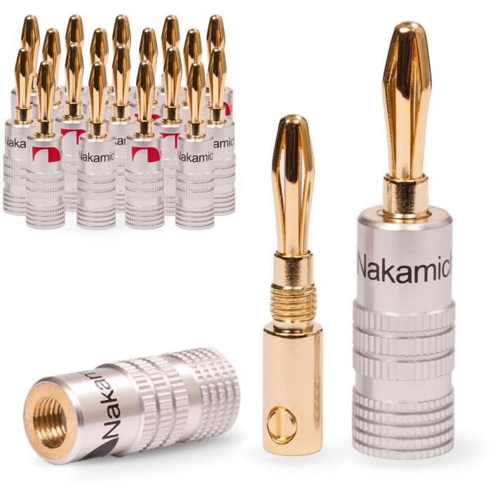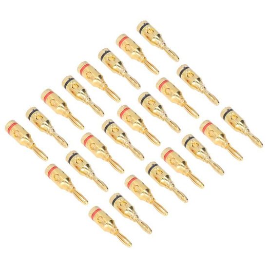 Salut les audiophiles et les bidouilleurs de chaîne HiFi ! Pour des connexions propres et solides entre tes enceintes et ton ampli, ces connecteurs banane sont top. Le pack contient 20 fiches banane plaquées or 24 carats – l'or améliore la conductivité et résiste à l'oxydation. Le diamètre de la fiche est de 4 mm, le standard pour la plupart des borniers d'ampli et d'enceintes. La marque est ThatCable, et le modèle est CA008Gx20. Elles sont neuves, dans leur emballage. Ces connecteurs te permettent de terminer proprement tes câbles haut-parleur (les fameux \câbles de sono\) : tu dénudes le fil, tu le serres dans la fiche, et hop, tu as une connexion qui s'enfonce et se retire facilement des borniers. Beaucoup plus pratique et pro que de visser le fil nu. Parfait pour monter un système home cinéma surround, une installation stéréo, ou pour améliorer ta sono actuelle. Les dimensions du pack sont d'environ 30 x 25 x 2.5 cm, pour un poids de 0.26 kg. Un accessoire simple qui fait la différence en qualité de connexion et en facilité d'utilisation. Code EAN : 5055538112317.