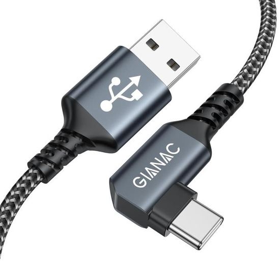 Ce câble USB-C a une particularité super pratique : une de ses extrémités (souvent la connexion au téléphone/tablette) est à 90 degrés (angle droit). Pourquoi ? Pour éviter que le câble ne plie et ne s'abîme à la base du port, et surtout pour réduire l'encombrement quand votre appareil est en charge sur une table ou dans un endroit serré.