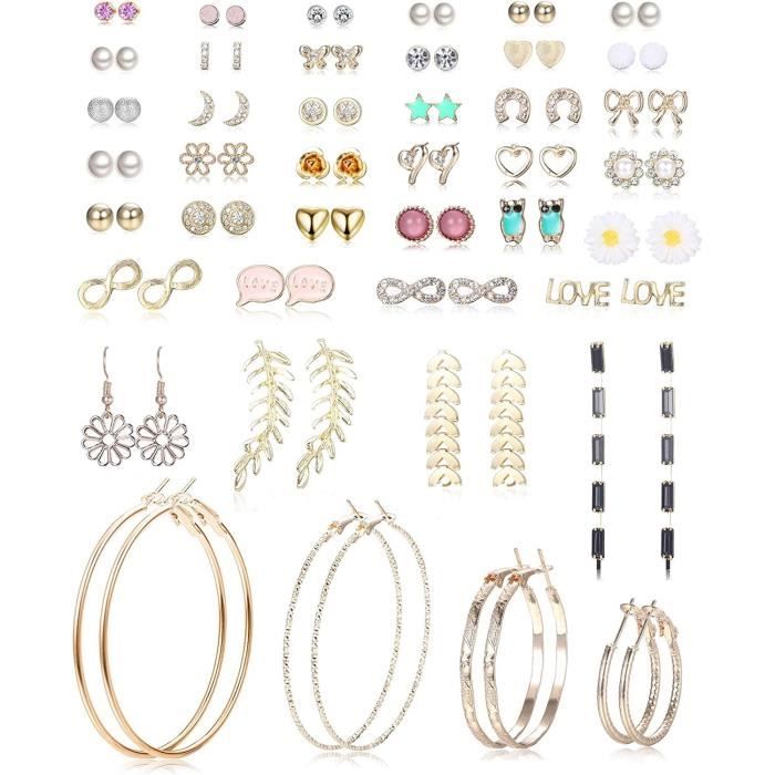 Un cadeau idéal ou un bon plan pour renouveler ta collection de bijoux ! Ce lot comprend 36 paires de boucles d'oreilles clous (stud earrings) en cristal coloré. Les pierres sont rondes, de différentes couleurs vibrantes, montées sur une tige en métal avec fermoir \push-back\ (à clipser). Style tendance (TRENDY), parfait pour un look casual, de soirée, ou pour le quotidien. Marque générique, fabriqué en Chine (Zhejiang). C'est neuf, avec étiquettes. Pas de métal précieux, c'est de la bijouterie fantaisie, donc léger et hypoallergénique pour la plupart. Parfait pour offrir à une ado, une amie, ou pour toi-même avoir un choix énorme à petit prix. Avec 36 paires, tu as de quoi assortir à toutes tes tenues !