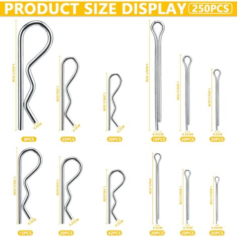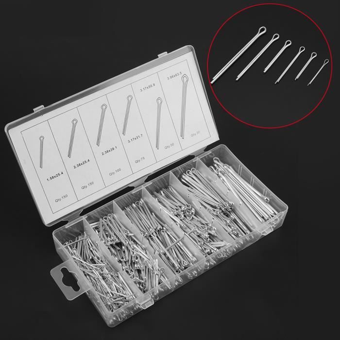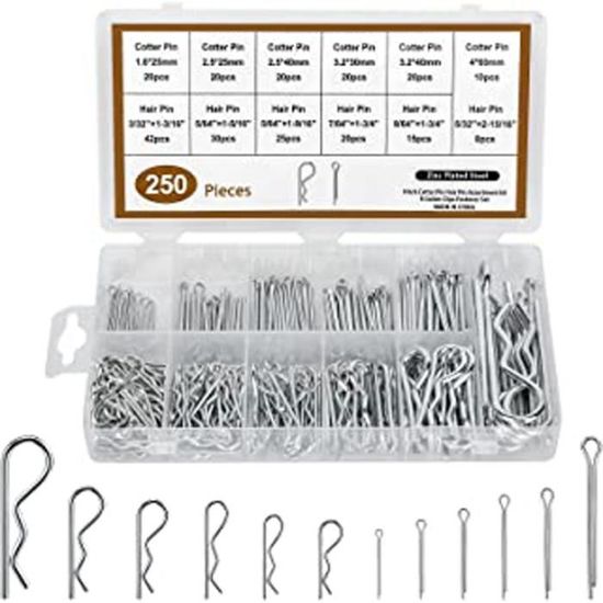 Pour les bricoleurs, mécaniciens et artisans ! Ce lot économique contient 360 goupilles à rouleaux (ou \roll pins\) de tailles variées, toutes en acier 65Mn de haute qualité pour une excellente résistance et élasticité. Ce sont ces petites goupilles fendues et légèrement coniques qu'on insère dans un trou pour maintenir des axes, des pièces rotatives ou des assemblages - elles se compriment et s'expandent pour une tenue solide.