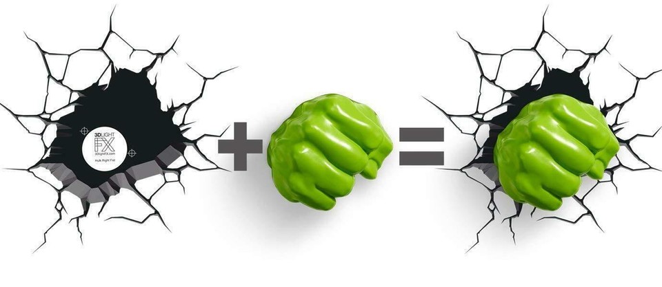 Les fans de Marvel et d'Avengers, ceci est pour vous ! Cet autocollant mural Hulk en 3D avec LEDs est trop stylé. Il comprend deux motifs : le visage menaçant de Hulk et son poing serré, le tout en plastique vert rétro-éclairé par des LEDs (couleur verte). L'alimentation se fait sur piles, et il y a un interrupteur pour allumer/éteindre. La luminosité est douce (200-399 lumens), parfaite pour une ambiance dans une chambre, un salon geek, ou une salle de jeu. Le modèle c'est SOURCE 49467, la marque FX, et l'EAN est 816733002194. Tu peux le fixer au mur avec des adhésifs ou des vis (selon ton mur). C'est neuf, dans son emballage. Idéal pour un cadeau d'anniversaire, pour compléter une collection Marvel, ou pour ajouter une touche super-héroïque à ta déco. Les enfants (et les grands enfants) vont adorer. Attention, consommation mini (4W ou moins). Bref, fais entrer la force verte chez toi avec ce sticker lumineux. Prêt à transformer ton mur en quartier général des Avengers ? Ce Hulk LED est là.