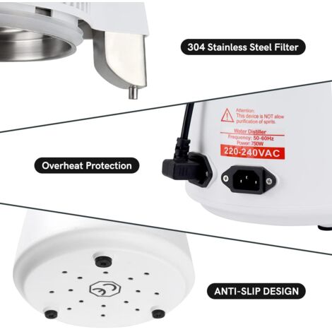 Produis ta propre eau distillée pure pour des usages exigeants avec cet appareil compact. D'une capacité de 4 litres et d'une puissance de 750 Watts, il chauffe, vaporise et condense l'eau pour éliminer les minéraux, les impuretés et les microbes, produisant une eau de grande pureté.