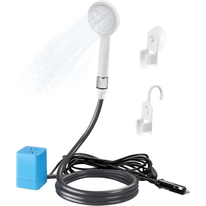 Partir en camping ou en road-trip sans douche ? Plus maintenant ! Cette douche portable 12V est ultra pratique : elle comprend une pompe à eau, un seau de 20 litres, un tuyau de 2 m, une pomme de douche, et même une ventouse et un crochet pour l'accrocher. Alimentée sur prise allume-cigare de voiture (12V), elle tire l'eau du seau et te permet de te laver où tu veux. Longueur du fil électrique : 5 m – tu peux t'éloigner un peu du véhicule. Puissance : 35-60W, débit max 3,5 L/min. Parfaite pour le camping, la randonnée, le surf, le lavage de voiture, ou même pour laver ton chien après une balade boueuse. Matière ABS résistante, couleur bleue. Garantie 6 mois. Si tu aimes l'aventure mais que tu apprécies un minimum de confort, ce kit est fait pour toi. Facile à monter, à ranger (sacs inclus), et à utiliser. Plus besoin de se ruiner dans les campings avec sanitaires : ta douche privative te suit partout !