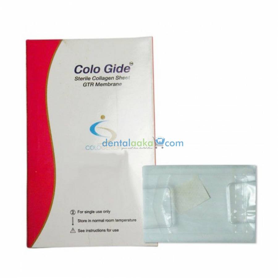 Lot de 5 feuilles stériles de membrane Colo Gide en collagène, dimensions 20 x 32 mm. Utilisées en dentisterie pour la régénération tissulaire guidée (GTR). Produit neuf, intact, sous blister stérile d'origine. Marque : ColoGenesis. Modèle : colo gide. Pays de fabrication : inconnu. Parfait pour les interventions parodontales. Vérifiez la compatibilité avec votre pratique clinique.