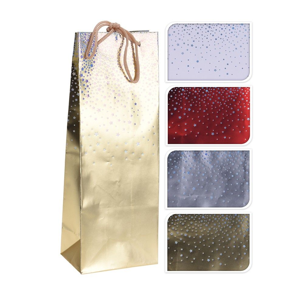 Pour offrir une bouteille avec style ! Ce lot comprend 6 sacs-cadeaux spécialement conçus pour une bouteille de vin ou de champagne. En papier brillant et holographique, ils scintillent de multiples couleurs et donnent un effet 'fête' immédiat. Taille standard pour une bouteille. Ils sont neutres et conviennent à toutes les occasions : anniversaire, Noël, mariage, départ à la retraite, etc. Produit neuf dans son emballage d'origine, marque générique. Plus besoin de galérer avec du papier cadeau, tu glisses la bouteille dedans, tu fermes avec le ruban intégré (ou le tien), et le tour est joué pour un cadeau qui fait son effet ! Pratique, économique et beaucoup plus joli qu'un simple sac en papier.