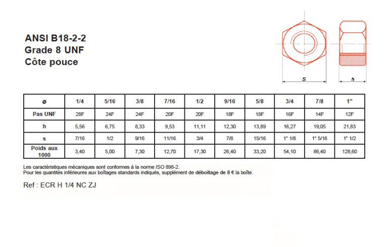 Ce lot contient 50 écrous hexagonaux de 1/2 pouce (soit environ 12,7 mm), de Grade 8. Le Grade 8 est une désignation américaine pour des écrous en acier à haute résistance, traités thermiquement pour supporter de fortes charges et des vibrations. La finition est en zinc jaune, qui offre une bonne protection contre la corrosion (pour un usage intérieur ou extérieur modéré). Ils sont vendus neufs, dans leur emballage d'origine, jamais utilisés. Référence MPN 8HN12. Parfaits pour les applications mécaniques exigeantes : suspension auto, remorquage, constructions métalliques, machines agricoles, etc. Si vous faites de la réparation de véhicules, du bricolage industriel, ou si vous avez besoin de fixations ultra-solides, ces écrous sont faits pour vous. Vérifiez bien que le filetage correspond (probablement UNC ou UNF). Un lot de 50, c'est pratique pour en avoir toujours sous la main. Attention, le Grade 8 est souvent associé à des boulons de même grade pour une performance optimale. Des écrous sérieux pour des projets sérieux.