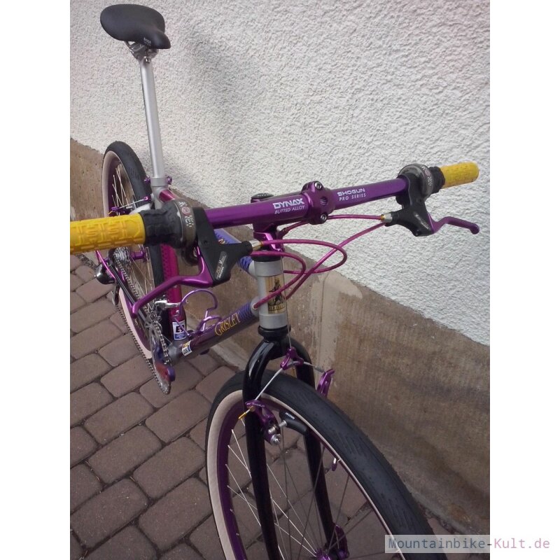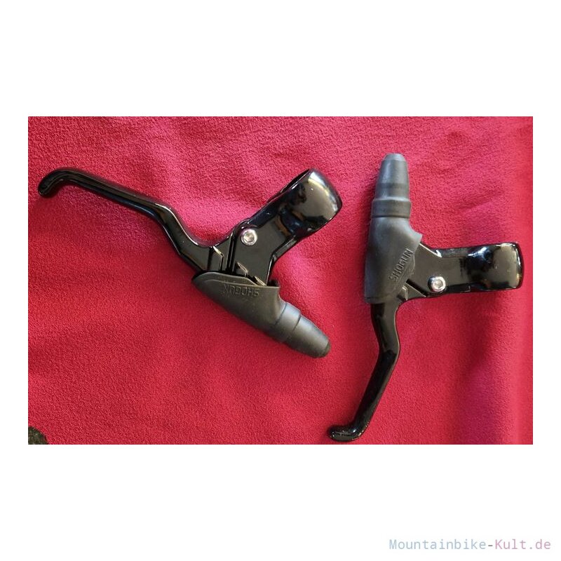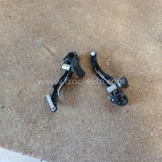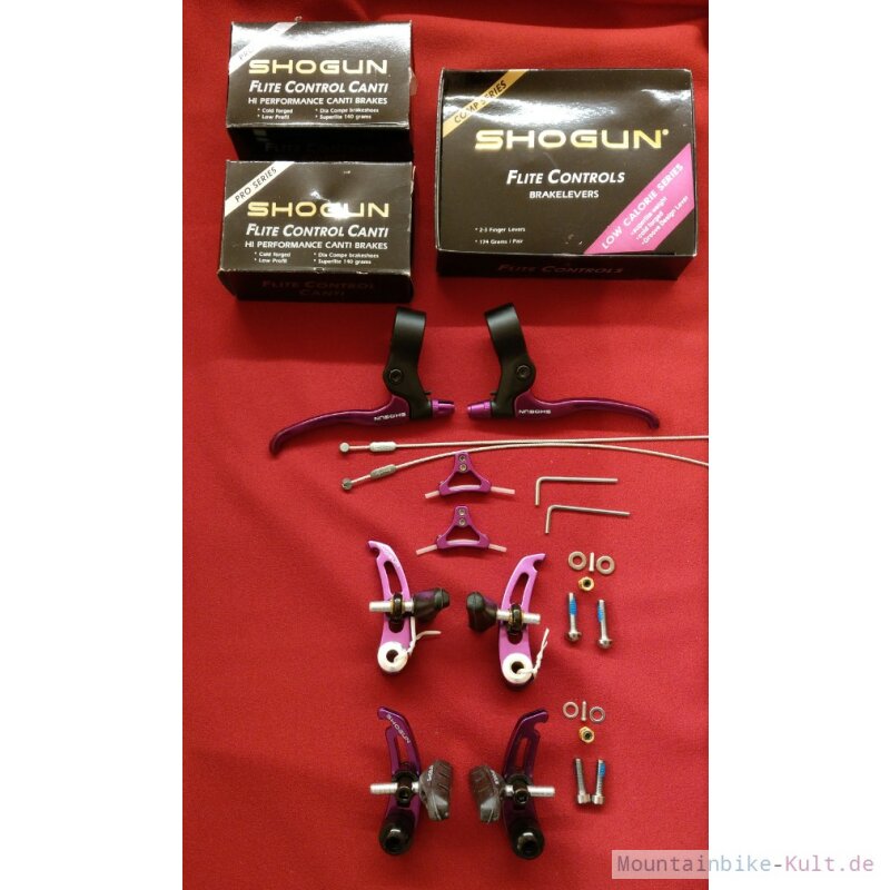 Une paire de freins cantilever Shogun Flite Controls, couleur violet, pour VTT. C'est du neuf ancien stock (NOS - New Old Stock), donc jamais monté, mais d'un modèle plus ancien, très apprécié des amateurs de VTT vintage ou \cultes\. Position : arrière. Ils sont complets, avec likely les patins et les câbles (à vérifier sur photos). La couleur violette est assez distinctive, parfaite pour restaurer un VTT des années 90 ou pour un projet rétro avec du style. Marque Shogun, qui était réputée à l'époque. Type de frein : cantilever, le standard sur les VTT avant l'ère des V-brakes et des disques. Compatible avec les cadres et fourches prévus pour cantilever. Pas de numéro EAN ou constructeur spécifique. Si tu rénoves un vieux mountain bike, que tu fais du single-speed rétro, ou que tu cherches des freins fiables et simples à régler, ces Shogun sont un excellent choix. Le fait qu'ils soient neufs en emballage d'origine est un gros plus, car trouver des cantilevers neufs de cette qualité aujourd'hui n'est pas simple. La couleur peut être un atout esthétique majeur. Pense à vérifier la longueur des patins et l'état des câbles fournis. Un vrai morceau d'histoire du VTT, en état impeccable.