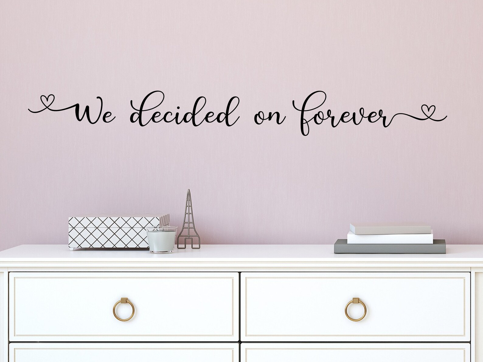 Cherchez-vous une petite touche romantique et personnelle pour votre intérieur ? Cet autocollant mural est parfait ! Il affiche la jolie phrase \We decided on forever\ (On a choisi pour toujours). C'est une déco hyper tendance pour la chambre, le salon ou même en photo de mariage. Il mesure 8 pouces de haut sur 48 pouces de long (environ 20x122 cm), donc il a de la présence sans être écrasant. Le style est contemporain, épuré. Le produit est neuf, en excellent état. Petit détail à savoir : il peut être vendu sans son emballage d'origine scellé (par exemple dans un simple sachet), et il y a une très petite chance qu'il ait un défaut esthétique minuscule qui n'affecte pas du tout son utilisation (une micro-rayure par exemple). Mais globalement, c'est un produit top pour transformer un mur nu en un instant. Facile à poser (en principe, ça se décolle sans abîmer), et ça change toute une pièce ! Parfait pour un cadeau de couple aussi.