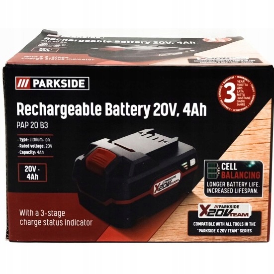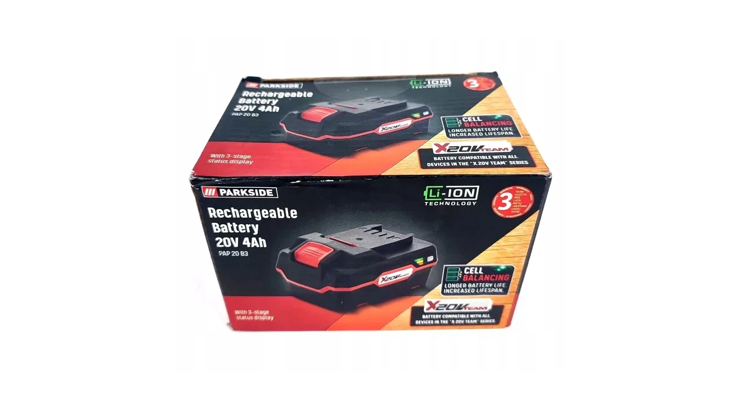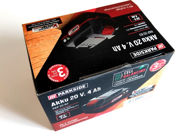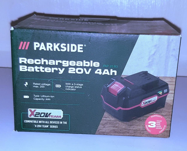 Cette batterie est neuve, dans son emballage d'origine. C'est une batterie lithium-ion Parkside, modèle PAP 20 B3, avec une tension de 20V et une capacité de 4Ah. Elle est compatible avec tous les outils électroportatifs de la gamme Parkside 20V (perceuse-visseuse, scie, ponceuse, etc.) qui utilisent ce type d'accumulateur. La couleur est noire, typique de la marque. Parfaite pour remplacer une batterie fatiguée, pour avoir une autonomie plus longue (4Ah c'est pas mal !), ou pour avoir une batterie de rechange lors de gros chantiers. Livrée chargée ? Pas sûr, mieux vaut la charger complètement avant la première utilisation. Un achat malin pour prolonger la vie de tes outils Parkside sans racheter une machine complète. Attention à bien vérifier la compatibilité avec ton modèle d'outil spécifique. Fabriqué par Parkside (marque Lidl), qualité correcte pour le prix. Un essentiel pour le bricoleur équipé en vert et noir !