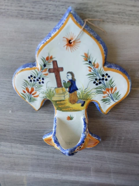 Pour les amateurs d'antiquités et d'art populaire breton, voici une belle gourde en faïence de Quimper, datant de la fin du XIXe siècle. Elle présente un décor typique avec un blason de la Bretagne et une figure féminine, dans le style traditionnel de Quimper.