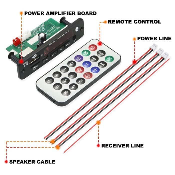 Besoin d'ajouter du Bluetooth à votre installation audio ? Ce petit module est un couteau suisse ! C'est à la fois un décodeur audio Bluetooth (pour streamer depuis votre phone) ET un amplificateur de puissance qui peut délivrer jusqu'à 2 x 40 watts (selon l'alimentation). Il se branche sur du 7 à 20 volts continus, donc parfait pour une alimentation 12V de voiture, sur batterie, ou via un transfo. Marque générique, mais bien fini. Il lit aussi les cartes microSD et a une entrée auxiliaire. Idéal pour fabriquer une enceinte Bluetooth DIY, améliorer une vieille chaîne, ou faire une installation audio perso dans un atelier ou un camping-car. Neuf, livré avec ses câbles de connexion souvent. Un projet sympa et pas cher pour les bricoleurs audio !