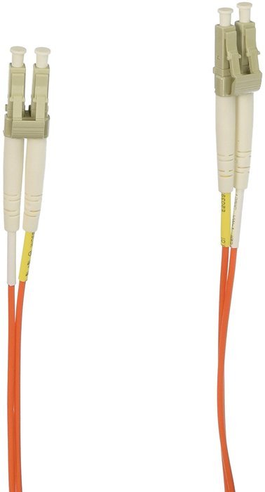 Un câble de raccordement (patch cord) fibre optique, type LC-LC, multimode 62.5/125 microns, en version duplex (deux fibres), longueur 2 mètres, couleur orange.