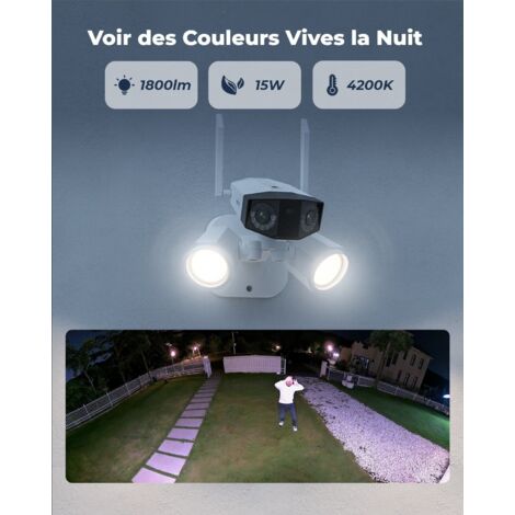 Le gros atout ? Elle a DEUX objectifs, offrant un champ de vision ultra-large de 180° horizontal. La résolution est en 4K (8MP), donc une image hyper nette. Elle possède une vision nocturne en couleur grâce à son projecteur, ainsi qu'une vision IR classique jusqu'à 30 mètres.