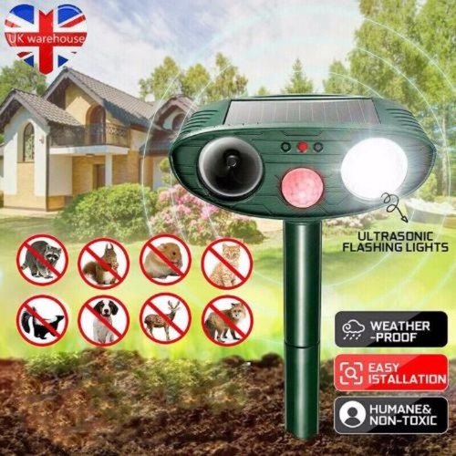 État : Neuf. Il fonctionne à l'énergie solaire (batterie incluse de 500mAh) et se recharge tout seul. Dès qu'un animal entre dans sa zone (détecteur PIR), il émet des ultrasons puissants (9KHz-36.5KHz) très désagréables pour eux, mais inaudibles pour l'homme.