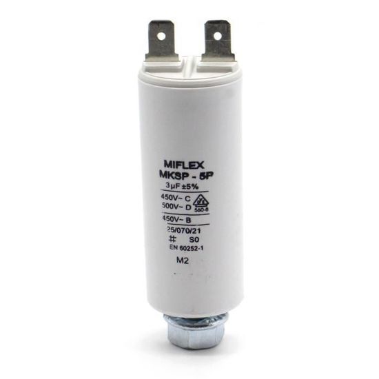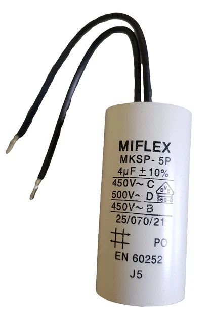 Pour réparer ou entretenir vos moteurs électriques (pompes, ventilateurs, compresseurs…), ce condensateur Miflex de 5µF 450V est parfait. Modèle MKSP-5P, avec des fils câblés pour une connexion facile. Il est en film de polypropylène métallisé, fixe, avec une tolérance de ±5%. Dimensions : 28 mm de diamètre, 51 mm de long. Poids 48g. Fabriqué en Pologne, avec une garantie de 2 ans. Tension max d’utilisation 500V AC, températures de -25°C à +70°C. C’est du neuf, dans son emballage d’origine. EAN 3701551802330. Un condensateur de qualité, fiable, pour un démarrage et un fonctionnement stable de votre moteur. Indispensable dans la trousse de l’électricien ou du réparateur.