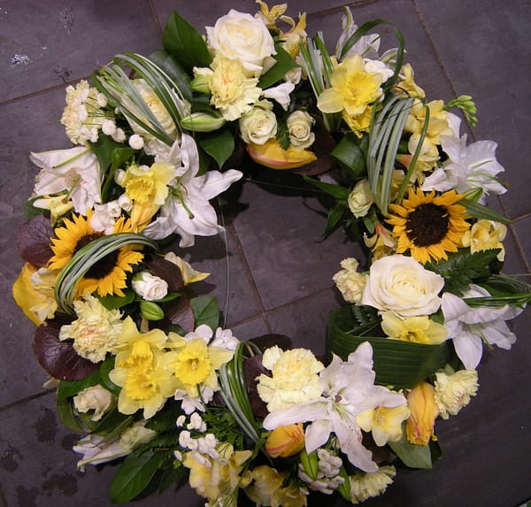 Pour un dernier hommage plein de douceur et de respect... Cette couronne funéraire de 60cm (2 pieds) est réalisée en soie artificielle de belle qualité, avec de superbes fleurs bleues. Conçue pour un hommage à un grand-père, elle peut être personnalisée selon vos souhaits. Vous pouvez choisir la couleur de la bordure du ruban, la couleur principale des œillets, celle des roses en bouquet, et bien sûr, ajouter un message personnalisé sur l'écharpe. Créée au Royaume-Uni par Silky Bouquets, elle est neuve et soigneusement emballée. C'est une alternative durable et élégante aux fleurs fraîches, qui restera belle dans le temps. Une manière délicate et touchante d'exprimer votre affection et vos souvenirs lors d'une cérémonie. N'hésitez pas à nous contacter pour discuter de la personnalisation.