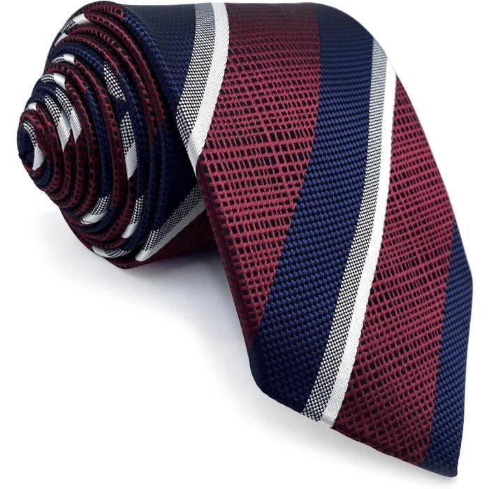Une belle cravate classique pour homme, parfaite pour habiller un costume avec élégance. Elle est en 100% soie, tissée en jacquard, ce qui donne du relief et de la qualité au motif. Le design est à rayures, avec des bandes rouges et bleu marine sur un fond sombre, un choix intemporel et sophistiqué. Longueur standard (entre 57 et 60 pouces, soit environ 145-152 cm). La marque est indiquée comme 'Handmade' (fait main), ce qui suggère une attention aux détails. Elle est neuve mais vendue sans étiquette ni emballage d'origine (donc peut-être en surplus de stock). Idéale pour le bureau, un mariage, une cérémonie, ou tout événement où tu veux faire bonne impression. Un accessoire essentiel de la garde-robe masculine.