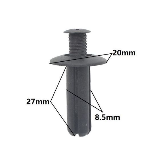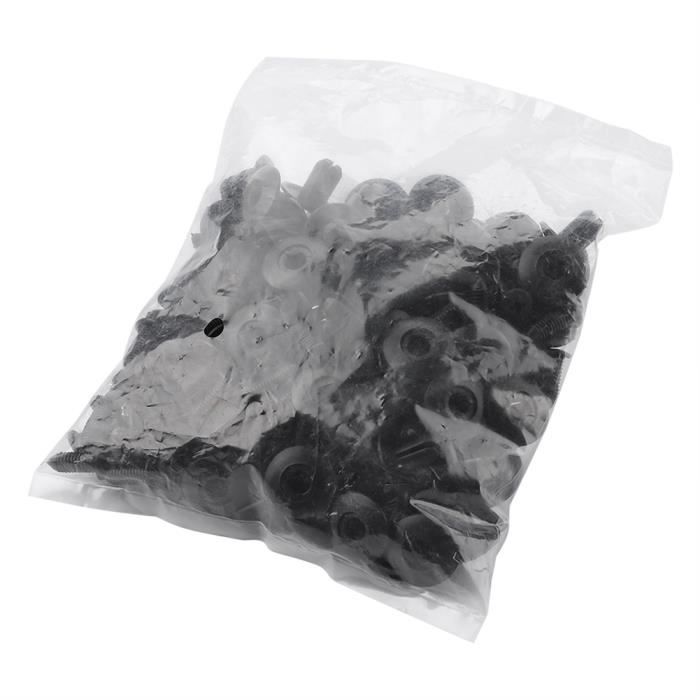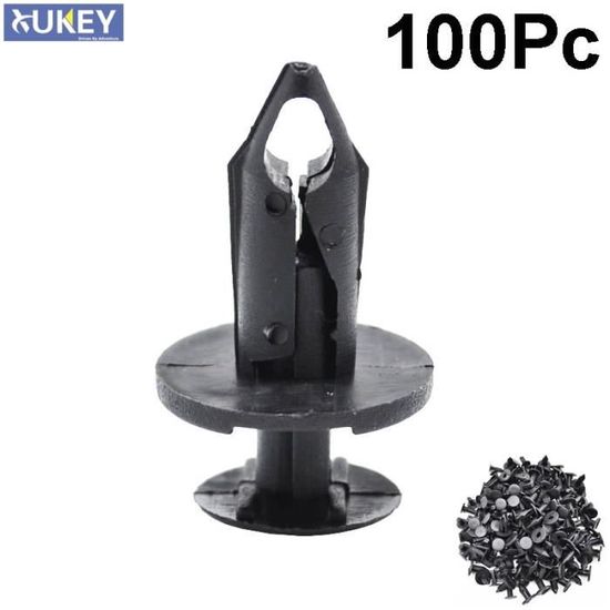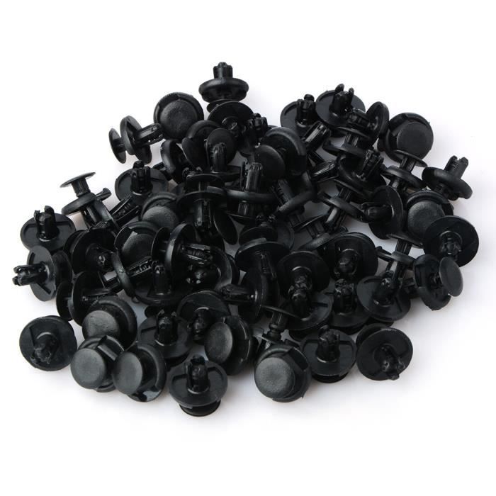 Vos clips de pare-chocs, de pare-boue, de jupes latérales ou de panneaux intérieurs sont cassés ? Ce lot de 100 clips de fixation en nylon noir est la solution économique et pratique. Ils sont de type \arbre de Noël\ (poussoir), avec un diamètre de trou de 8 mm, une tête de 18 mm et une longueur totale de 22 mm. En nylon résistant, ils sont faciles à installer (il suffit de les pousser dans le trou) et étanches. Universels, ils peuvent remplacer de nombreuses références constructeur (Chrysler, Ford, GM, etc.) et s'utilisent sur tout le véhicule. Parfaits pour les bricoleurs auto, les réparateurs, ou pour avoir toujours des pièces de rechange sous la main. Neufs, avec une garantie d'un an. Un produit basique mais indispensable pour remettre en état les fixations plastiques de votre voiture, camionnette ou moto, et éviter les bruits parasites ou les pièces qui pendouillent.