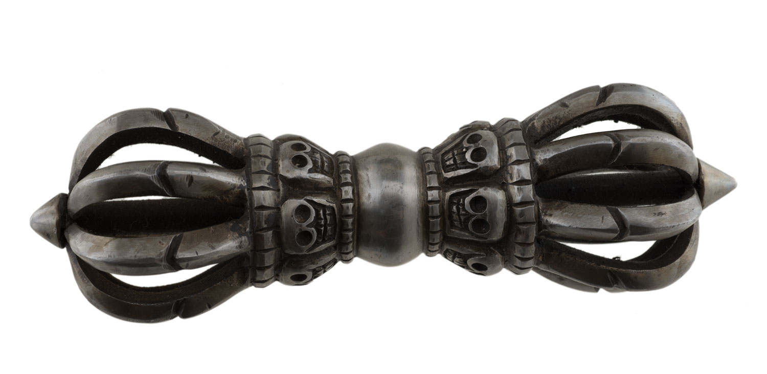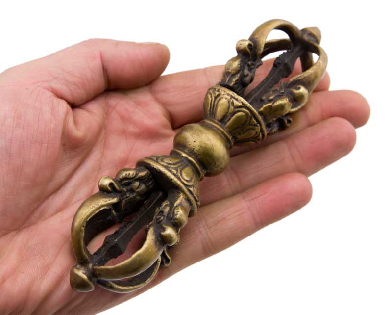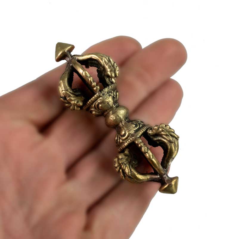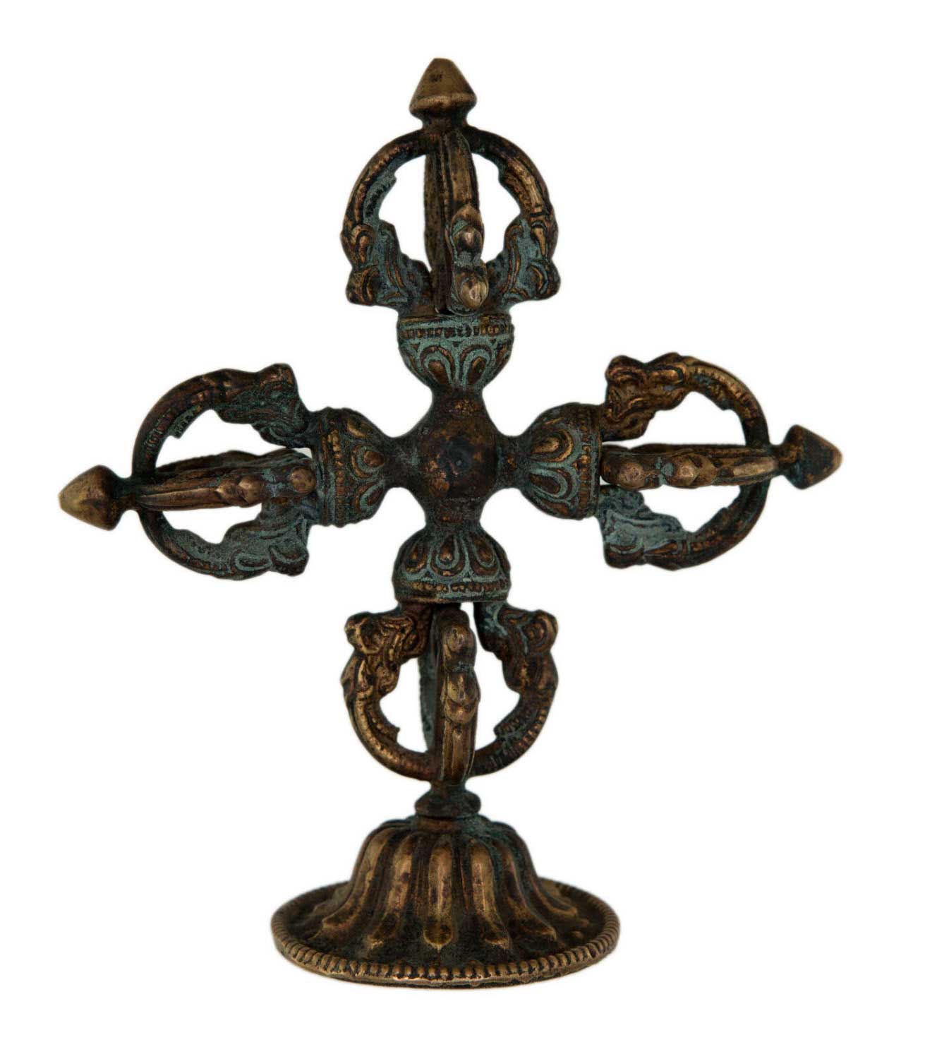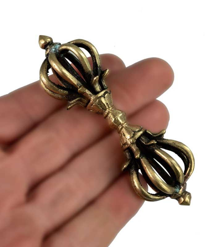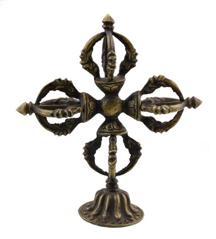 Objet spirituel et décoratif magnifique, ce Double Dorje (aussi appelé Vajra) est un symbole central du bouddhisme tibétain, représentant la compassion et la méthode habile. Il est composé de deux vajras croisés formant 5 branches de chaque côté. Il est posé sur un petit socle, ce qui permet de l'exposer facilement. Dimensions totales : environ 14 cm de haut. Il est en métal (probablement alliage de cuivre ou laiton), avec une patine d'âge. C'est un objet D'OCCASION, provenant probablement du Népal, ce qui lui donne une aura authentique. Il peut présenter des signes d'usure légers, mais c'est ce qui fait son charme. Parfait pour un autel, pour la méditation, ou comme pièce de décoration ethnique et spirituelle. Une pièce chargée de sens.