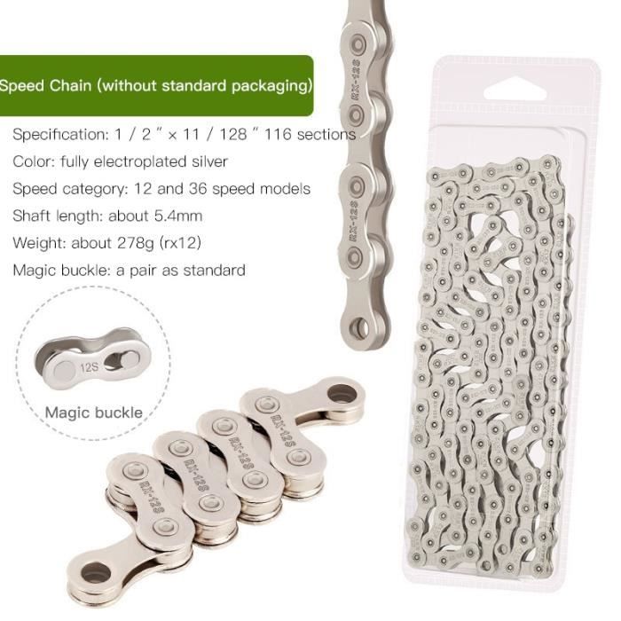 Pour remettre votre VTT, vélo de course ou hybride en état, cette chaîne BUCKOLOS EL est une excellente option. Elle est compatible avec les transmissions 9, 10, 11 et 12 vitesses ! Il faut bien choisir la longueur : 116 maillons pour les 9/10/11 vitesses, et 126 maillons pour les 12 vitesses (le vendeur le précise dans son commentaire). Elle est fabriquée en acier et existe en finition argent ou or. Conçue pour être compatible avec les groupes Shimano, SRAM et KMC, c'est une chaîne polyvalente et fiable. C'est neuf, vendu sans emballage retail peut-être. Parfaite pour un entretien régulier, un remplacement après usure, ou pour un projet de montage. N'oubliez pas de la couper à la bonne longueur pour votre dérailleur et d'utiliser un nouvel axe de raccordement ou un maillon rapide adapté à votre nombre de vitesses. Un produit essentiel pour tout cycliste qui veut garder sa transmission silencieuse et efficace. Bon rapport qualité-prix.