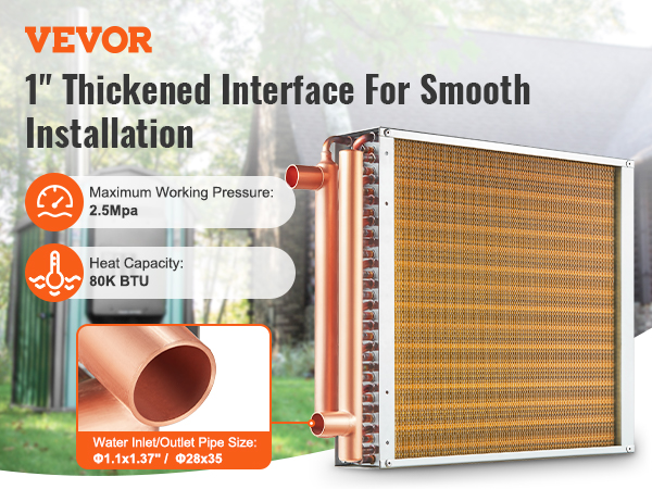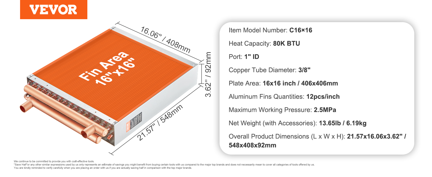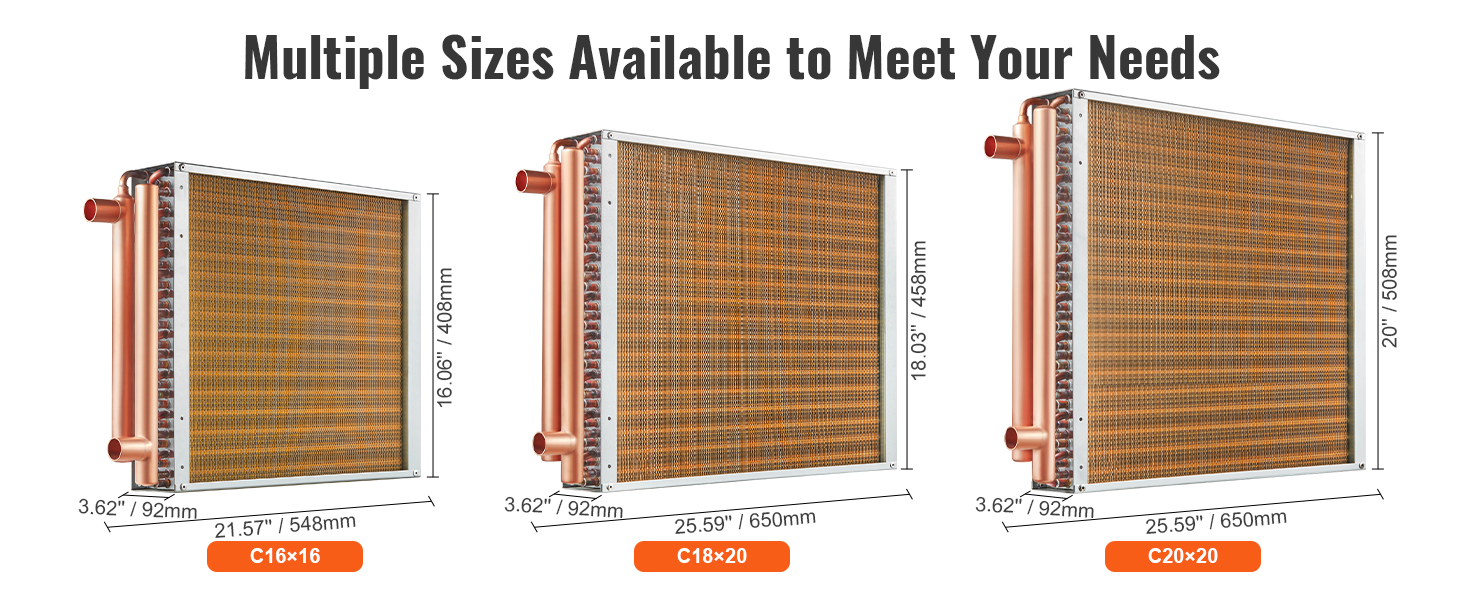 Pour vos projets de chauffage, de climatisation ou industriels, voici un échangeur thermique solide de chez VEVOR. Il fait 16 pouces sur 16 (soit environ 40,6 cm), avec 3 rangées de tubes en cuivre de 3/8 de pouce et pas moins de 193 ailettes en aluminium pour un transfert de chaleur optimal. Sa capacité thermique est d'au moins 80 000 BTU. Il supporte des pressions de travail jusqu'à 2,5 MPa et des températures extrêmes, de -40°C à +180°C. Il pèse environ 6,2 kg et ses dimensions globales sont indiquées. La finition est dorée. Neuf et robuste, c'est un composant clé pour les systèmes de transfert de chaleur eau/air. Vérifiez bien ses caractéristiques techniques pour votre application.