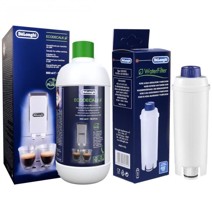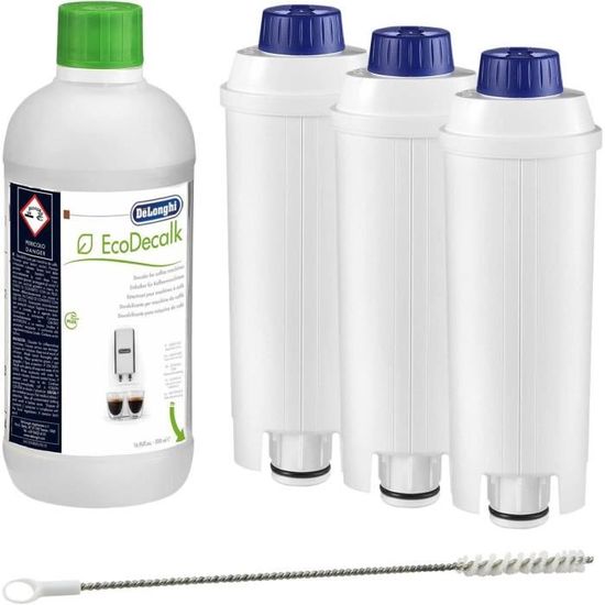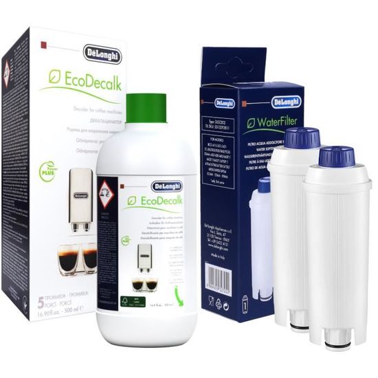Le détartrant permet d'éliminer le calcaire qui s'accumule dans les circuits internes de la machine, responsable d'une moins bonne chauffe, d'un café moins bon et à terme, de pannes. Les filtres à eau, quant à eux, adoucissent l'eau, réduisent le calcaire, et améliorent le goût de votre café. Chaque filtre a une capacité d'environ 50 litres. Le kit est compatible avec les machines à café automatiques De'Longhi utilisant le modèle de filtre DLS C002.