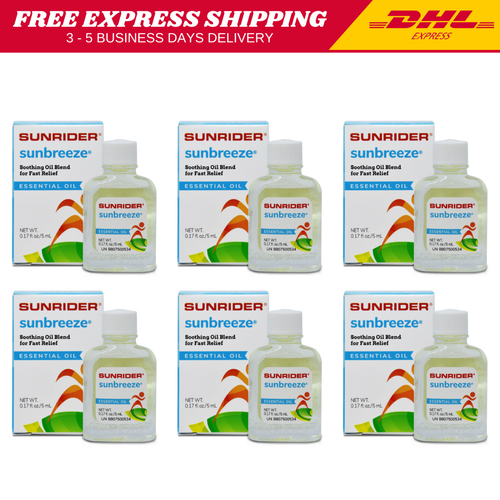Coucou pour un soulagement naturel ! Ce pack de 6 flacons d'huile essentielle Sunrider SunBreeze (5ml chacun) est top pour les muscles endoloris. Ingrédients actifs : huiles d'eucalyptus, de menthe et de cassia, avec du menthol pour un effet frais et apaisant. Utilisation : applique localement sur les zones douloureuses (muscles, articulations, tête). Formulation en huile, facile à masser. Parfum revigorant. Fabriqué aux États-Unis. Référence fabricant : B800460234. Produit neuf, jamais ouvert. Type : SunBreeze Essential, unisexe. Idéal pour les sportifs, les personnes actives, ou ceux qui ont des tensions au quotidien. Naturel et efficace. Unisexe, convient à tous. Chaque flacon fait 0.17 fl oz. Livraison soignée. Garde-en un dans ton sac de sport, un à la maison, un au bureau... Un must-have dans ta pharmacie naturelle. Essaye-le, tu vas l'adopter !