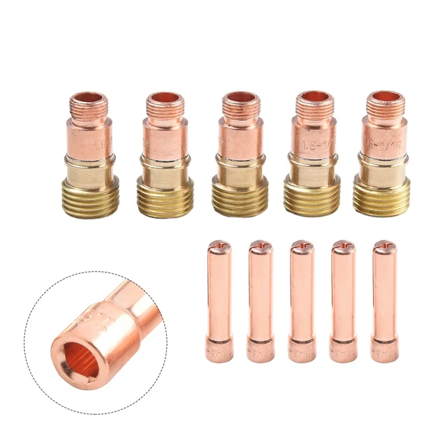 Pour les soudeurs TIG qui utilisent des torches WP 17, 18 ou 26 ! Ce kit pratique contient 10 pièces : des collets (objectifs à gaz) et probablement leurs écrous de serrage, de taille Stubby 17GL116. Cela correspond à des diamètres d'électrode de 1/16 de pouce ET de 1,6 mm.