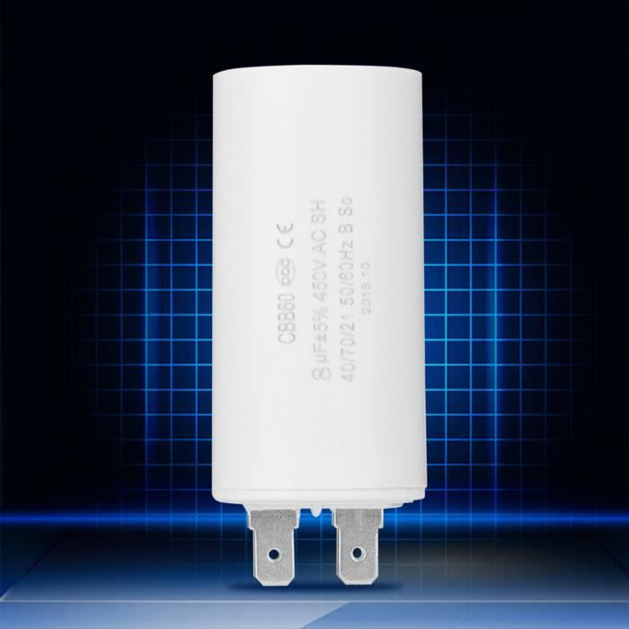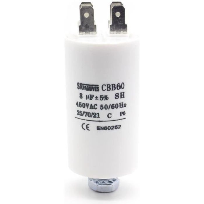 Un condensateur de qualité pour moteurs électriques ! Modèle CBB60F-8/450, capacité 8µF, tension 450V, en polypropylène. Dimensions : 35x60mm. Il fonctionne entre -25 et +70°C, avec une durée de vie de 3000h. Marque TNE / SR PASSIFS, EAN 4065444236596. Bornes à œillet M4. Neuf, dans son emballage. Si ton moteur de pompe, de compresseur, de machine-outil a besoin d'un nouveau condensateur de démarrage ou de fonctionnement, celui-ci est un remplacement fiable. La tolérance est de ±5%. Un composant essentiel pour assurer un bon démarrage et un fonctionnement stable de ton équipement. Pour bricoleurs avertis ou professionnels de la maintenance.