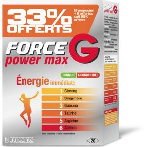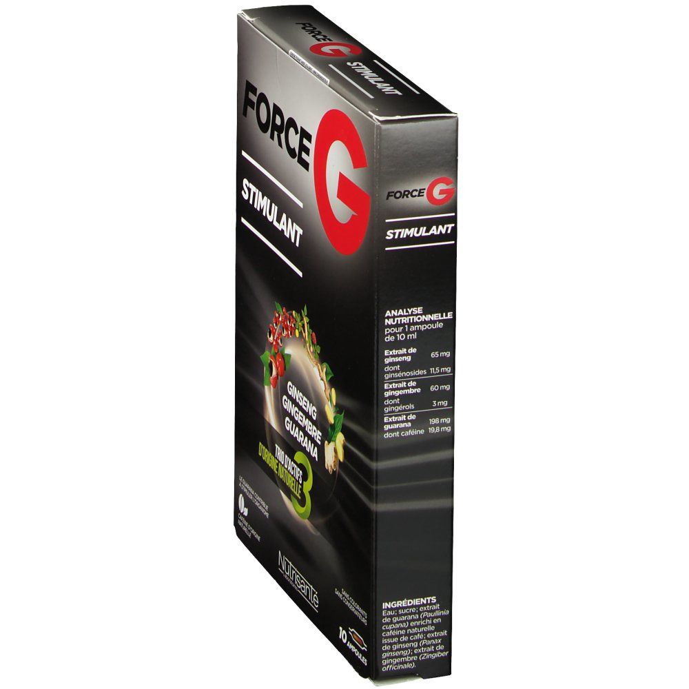 Besoin d'un coup de fouet, d'un peu plus d'énergie au quotidien ? Nutrisanté Force G Power Max est un complément alimentaire sous forme d'ampoules (10 dans la boîte). La formule est dite \renforcée\, à base d'herbes et de botanique, visant le bien-être général et peut-être un soutien dans la gestion du poids. Marque VITAVEA. Important : la date limite d'utilisation optimale (DLUO) est mars 2025, donc tu as encore du temps devant toi. Le produit est neuf, jamais ouvert. C'est pratique, une ampoule par jour, souvent à prendre le matin. Idéal en période de fatigue passagère, de changement de saison, ou quand on se sent un peu à plat. Comme tout complément, c'est un coup de pouce, à associer avec une bonne hygiène de vie. EAN : 3515450056493. Pense à lire la composition et les conseils d'utilisation. Parfait pour retrouver un peu de pêche !