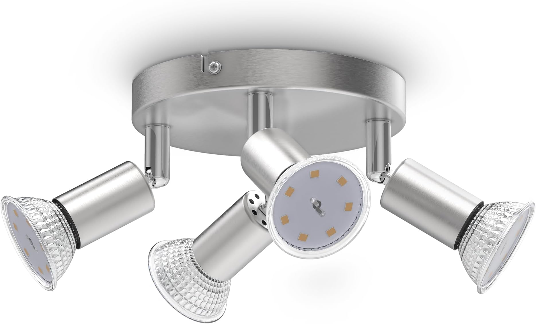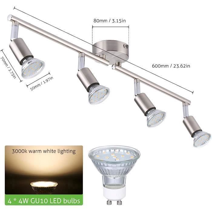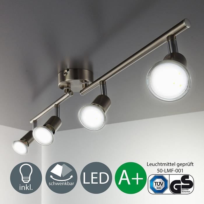 Cherchez un éclairage moderne et pratique pour votre intérieur ? Ce plafonnier LED avec 4 spots orientables est parfait. Il est neuf, dans son emballage d'origine. Marque B.K.Licht, référence BKL1024. Design épuré en métal, finition nickel mat. Les 4 spots sont sur des bras articulés, vous pouvez les orienter où vous voulez pour un éclairage ciblé (sur la table, un tableau...). Prise GU10, donc utilisez des ampoules LED GU10 (non incluses, mais recommandées 3W chacune). Tension 230V. Lumière blanc chaud (3000K), très agréable dans un salon, une salle à manger, une chambre ou même un bureau. Flux lumineux total d'environ 1000 lumens (4x250 lm). Il éclaire bien sans être aveuglant. Installation intérieure uniquement (IP20). Dimensions : 605 mm de largeur, 105 mm de hauteur. Léger et facile à monter au plafond (notice peut être incluse, vérifiez). Certifié CE. Durée de vie des LED : jusqu'à 20 000 heures, donc des années sans souci. Économique à l'usage. Convient à beaucoup de pièces (liste fournie). Style moderne qui s'intègre partout. Parfait pour remplacer un vieux lustre ou pour un nouveau projet. Livraison rapide, bien emballé. Un excellent rapport qualité-prix pour illuminer votre maison. Achetez en confiance, vous allez l'adorer !