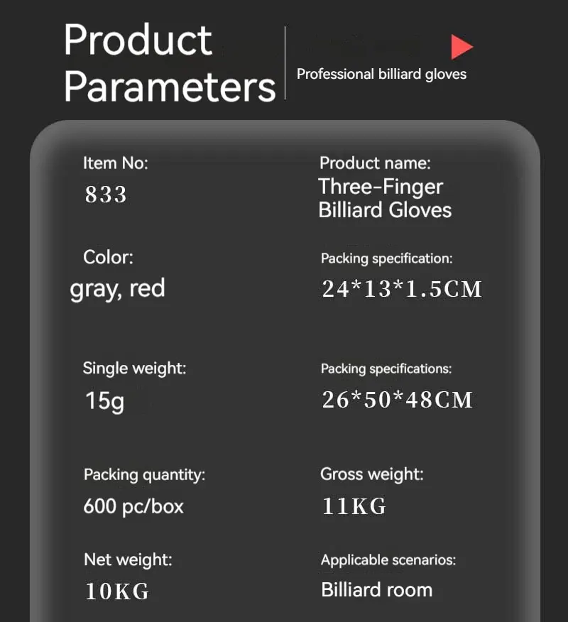Pour un coup de queue plus fluide et précis ! Ce gant de billard (disponible pour la main gauche ou droite) couvre seulement trois doigts (majeur, annulaire, auriculaire), laissant l'index et le pouce libres. En tissu stretch respirant, il réduit les frottements et l'effet \accrochant\ sur la queue, surtout par temps chaud ou si tu as les mains moites. Tailles disponibles : M et L. Il est neuf, fabriqué en Chine, sans marque spécifique. Un accessoire très apprécié des joueurs réguliers, que ce soit pour le snooker, le blackball ou le pool. Il améliore vraiment le confort et la régularité du geste. Essaye-le, tu ne joueras plus sans !