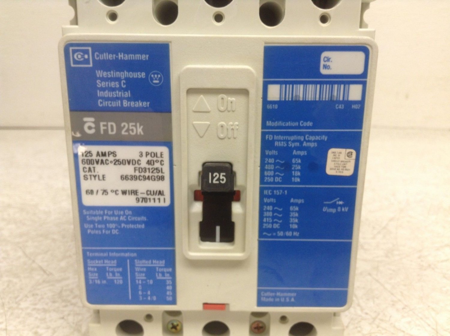 Pour les installations électriques industrielles ou les gros tableaux, ce disjoncteur Cutler-Hammer FD3125L est un équipement fiable. Il est neuf (état 'autre', voir détail vendeur), avec une garantie d'un an. Caractéristiques : 3 pôles, 125 ampères, 600 VAC. La marque Cutler-Hammer est reconnue pour sa qualité et sa durabilité. Essentiel pour la protection des circuits, la distribution d'énergie, ou le remplacement d'un vieux modèle. Si tu es électricien, chef de chantier, ou responsable maintenance, ce disjoncteur est un choix solide. Assure-toi de bien vérifier la compatibilité avec ton installation. Un produit pro pour une sécurité électrique maximale.