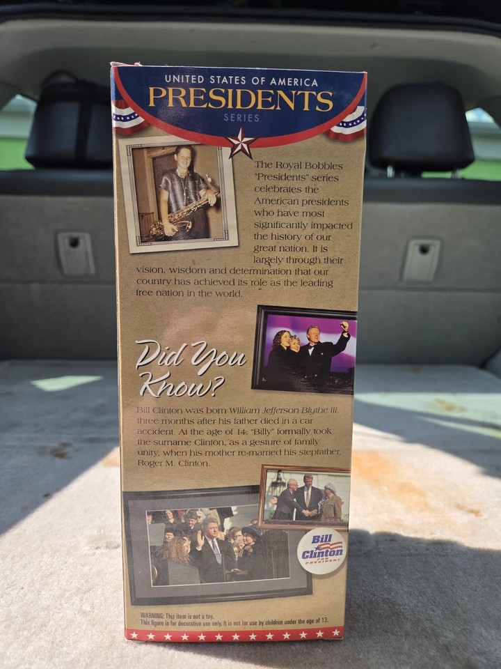 Cette figurine bobblehead (tête hocheuse) représente John Tyler, le 10e président des États-Unis. De la marque Royal Bobbles, modèle référence 12133 (UPC 814089012133). En plastique peint, design cartoon et humoristique. Neuf, jamais exposé, idéal pour les collectionneurs de bobbleheads, les passionnés d'histoire américaine, ou comme déco de bureau originale. Hauteur environ 15-20cm. Parfaite pour compléter une collection de présidents US, ou comme cadeau insolite pour un professeur d'histoire, un fan de politique, ou un ami qui aime les objets curieux. Emballage possiblement ouvert, mais figurine intacte et jamais utilisée. Tête qui oscille amusamment au moindre mouvement. Une pièce de conversation assurée !