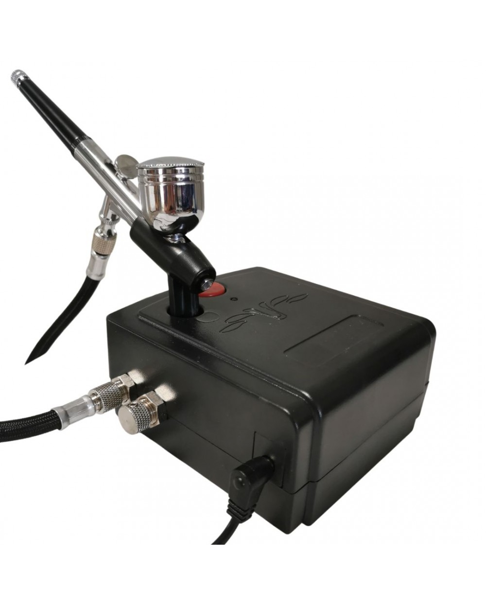 Le kit contient un aérographe double action (probablement) avec deux buses interchangeables : 0,3 mm et 0,5 mm. La buse fine (0,3) pour les détails précis, la plus large (0,5) pour les fonds et les dégradés. Il y a aussi un compresseur d'air qui délivre jusqu'à 48 PSI de pression, avec un réservoir pour un débit stable et sans à-coups.