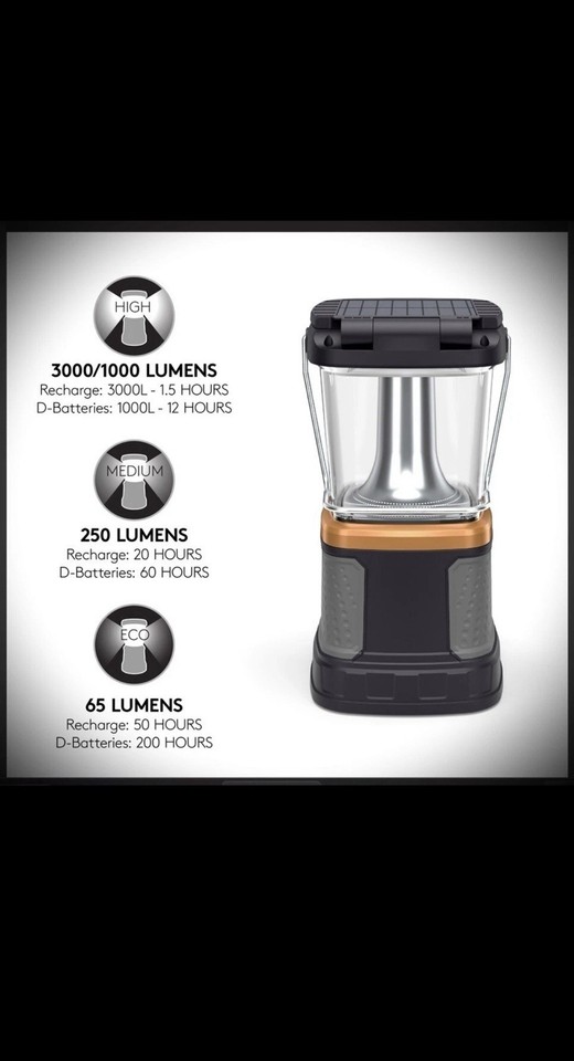 Cette lanterne Duracell TRI-Power, c'est la puissance et l'autonomie réunies ! Avec ses 2000 lumens, elle éclaire largement un camping, un jardin ou un abri. Le gros plus ? Elle se recharge de trois façons : par le soleil grâce à son panneau solaire, par un port USB (avec un câble que vous avez sûrement), et avec 4 piles type D (non fournies). Elle peut même servir de powerbank pour recharger votre téléphone en USB ! Elle a aussi un mode clignotant alerte. Dimensions : environ 26 cm de haut et 14 cm de large. Sans fil, bien sûr. Fabriqué par Duracell, donc la qualité de la LED et de la batterie est au rendez-vous. Parfaite pour le camping, les randonnées, les pannes de courant, ou comme lampe de travail. Produit neuf, dans sa boîte. Si vous voulez une source de lumière fiable, hyper puissante et qui ne vous lâchera pas, c'est un excellent choix. Un peu lourde (1 kg), mais c'est le prix de la robustesse. Livraison rapide. Un investissement malin pour être paré à toutes les situations, de la fête en plein air à la véritable urgence.