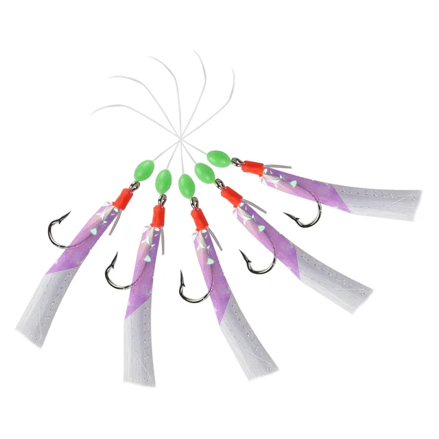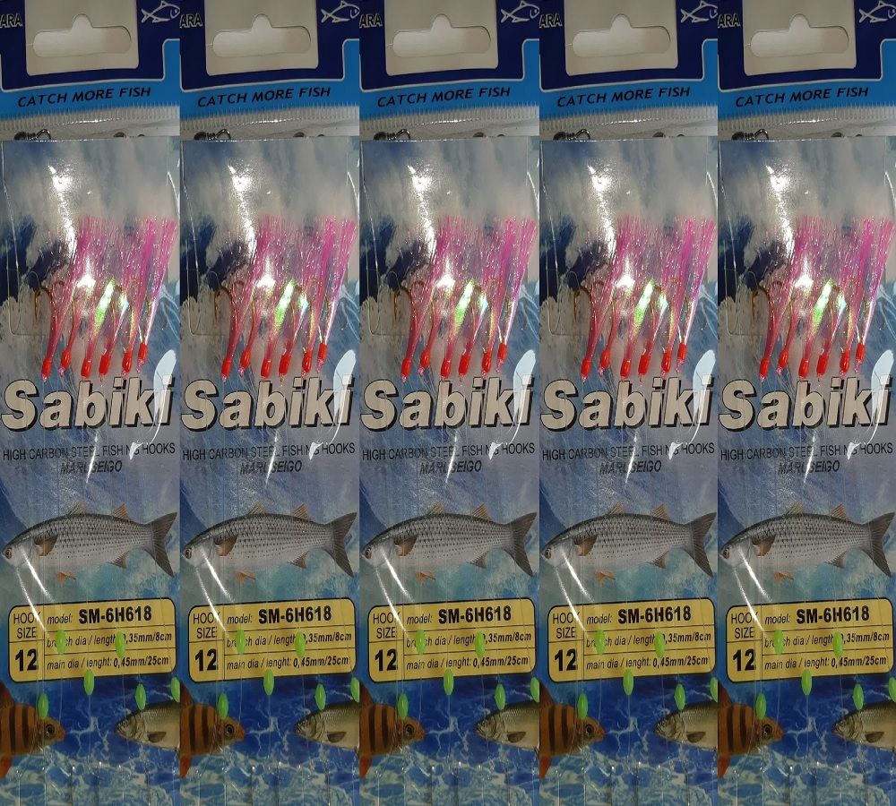 Pêcheurs en mer ou en eau douce, ces leurres Sabiki sont pratiques pour attraper des appâts vivants ou des petits poissons ! Le lot contient 2 montages, chacun avec 5 hameçons taille 16 et des leurres en forme de crevettes... qui brillent dans le noir ! Matière plastique luminescente. Marque C-Spin, modèle CF001. Cible : plie, maquereau, hareng, grondin, etc. Parfait pour la pêche depuis un quai, une jetée, ou un bateau. Nécessite un fil fin et une canne sensible. Neufs, sous emballage. Amusez-vous à remplir votre seau d'appâts !
