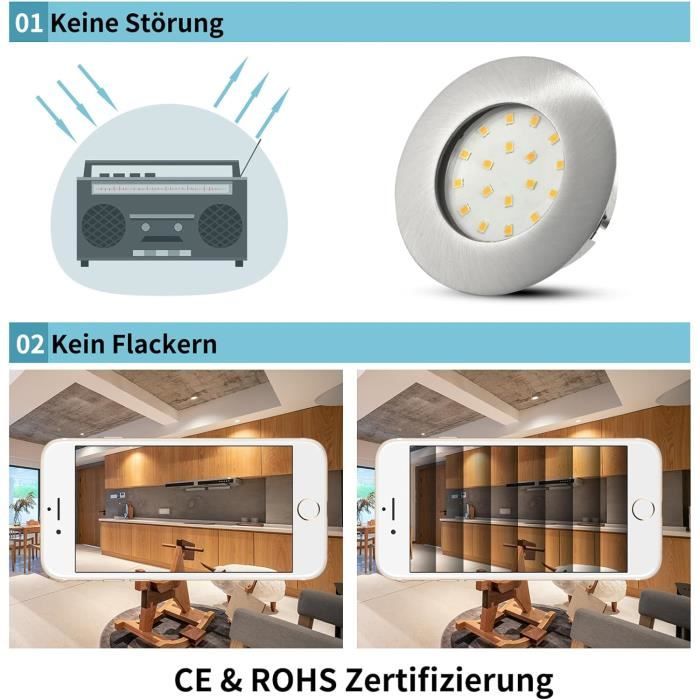 Tu veux moderniser ton éclairage sans gros travaux ? Ce lot de 6 spots LED encastrables est top ! Ultra-plats (3 cm de hauteur, diamètre 8.5 cm), ils s’installent facilement dans les faux plafonds. Puissance : 7W chaque (équivalent à ~60W halogène), lumière : 600 lumens. Bonus : ils sont dimmables et offrent 3 températures de couleur (blanc chaud 3000K, neutre 4000K, froid 5700K) que tu changes via l’interrupteur. Classe IP44 (résiste aux éclaboussures), donc ok pour salle de bain ou cuisine. Marque : ALUSSO. Garantie : 3 ans. Alimentation : 230V, filage fixe. Couleurs au choix : blanc, nickel brossé ou chrome. Éclaire ton intérieur avec style !