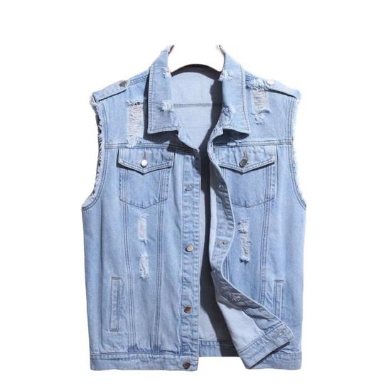 Coucou les fashionistas et les amateurs de style décontracté ! Ce gilet sans manches en jean (ou toile de coton style jean) a un look \déchiré\ et \camionneur\ super tendance. Il est en coton, confortable, se ferme avec des boutons. Tailles disponibles de 36 à 46 (vérifiez le guide des tailles). Il est neuf avec étiquettes, jamais porté. Parfait pour les soirées d'été, les festivals, ou pour ajouter une couche stylée sur un t-shirt. Département homme, coupe standard. Lavable en machine. Si vous aimez le style vintage, travailleur, ou rock, ce gilet est un must-have. Un bon basique qui se marie avec plein de fringues.