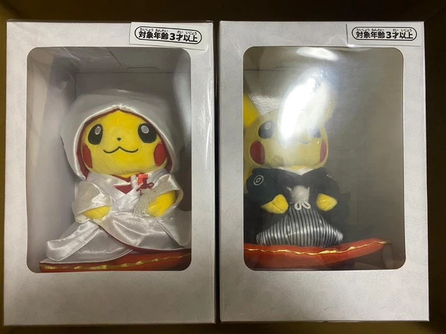 Coucou les fans de Pokémon ! Voici une paire adorable de peluches Pikachu, édition spéciale mariage du Pokémon Center Japon. Il y a un Pikachu mâle et un femelle, chacun avec des détails uniques pour l'occasion. Ils sont en peluche de qualité, multicolores. Dimensions : environ 200 x 160 x 110 mm pour le mâle, et 200 x 160 x 130 mm pour la femelle. C'est une édition limitée, parfaite pour les collectionneurs. L'état est d'occasion mais en bon état général. Une pièce rare et mignonne pour décorer ta chambre ou offrir à un fan. Franchise Pokémon, bien sûr !