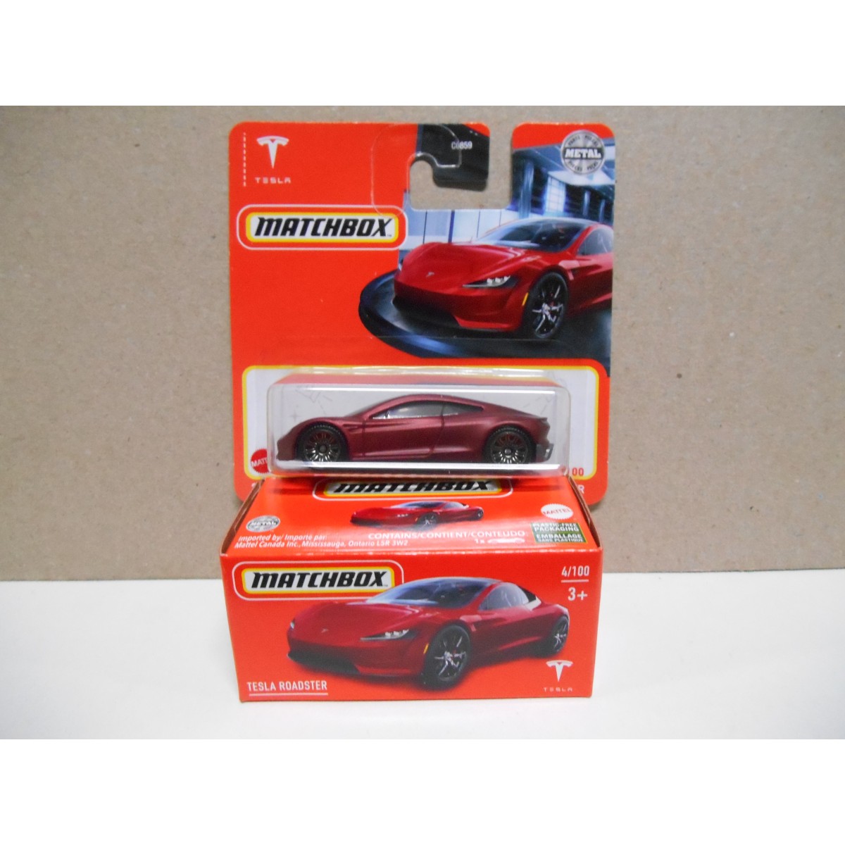 Voici une petite merveille pour les collectionneurs de miniatures ou les fans de Tesla ! C'est la reproduction Matchbox de la Tesla Roadster (le modèle sport électrique) à l'échelle 1:64. Elle fait partie de la série \4/100\ de l'année 2021. La voiture est en die-cast (métal) avec des détails soignés, et elle est peinte en rouge vif. Elle est neuve, jamais sortie de son blister ou de sa boîte (consultez l'annonce). Fabriquée en Thaïlande. C'est à la fois un jouet solide pour les enfants (à partir de 3 ans) et un objet de collection sympa pour les adultes amateurs de voitures ou de la marque Tesla. Parfaite pour compléter une collection Matchbox, pour jouer, ou pour décorer un bureau. Un petit modèle qui représente l'innovation et le design moderne. Un cadeau idéal et abordable pour un enfant ou un grand enfant passionné d'automobile.