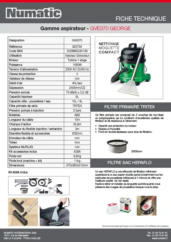 Ce moteur de dérivation (bypass) 2 étages en 230V est fait pour les aspirateurs industriels Numatic, modèles George GVE370 et GVE370-2. Référence d’origine probable : 205424, et notre code MTR145. Il est neuf, jamais installé, dans son emballage d’origine. Sans marque spécifique (générique), mais conçu pour être compatible. Si votre aspirateur George a perdu de la puissance, fait un bruit anormal ou ne s’allume plus, le moteur peut être en cause. C’est une pièce centrale, donc le remplacement redonne souvent une seconde vie à l’appareil. Prévoir une installation par un technicien si vous n’êtes pas à l’aise avec le câblage électrique. Parfait pour les ateliers, les garages ou les entreprises qui utilisent ce modèle d’aspirateur puissant.