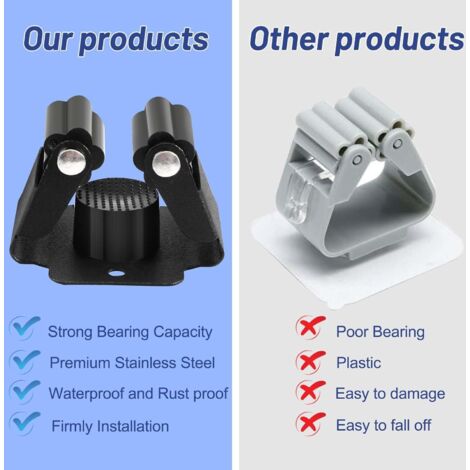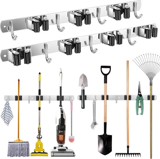 Pour ranger balais, raclettes, manches à balai, pelles, ou tout outil à long manche ! Ce lot de 2 supports muraux en acier inoxydable vous aide à organiser votre garage, cellier, ou local technique. Neufs, dans leur emballage.