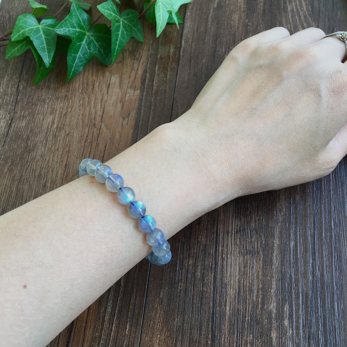 Salut ! Découvre ce bracelet artisanal en labradorite grade A, une pierre naturelle aux magnifiques reflets bleutés sur un fond gris. Chaque perle est unique et capte la lumière pour un effet vraiment spécial.
