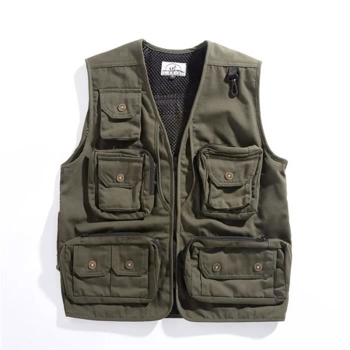 Il se ferme par une fermeture éclair complète, pratique pour réguler la température. Le style est décontracté mais fonctionnel, avec des accents qui rappellent les vestes militaires ou de travail. C'est vraiment le genre de veste sans manches que tu enfiles pour une randonnée automnale, une partie de chasse, du bricolage au frais, ou même pour un look casual en ville quand les températures baissent.