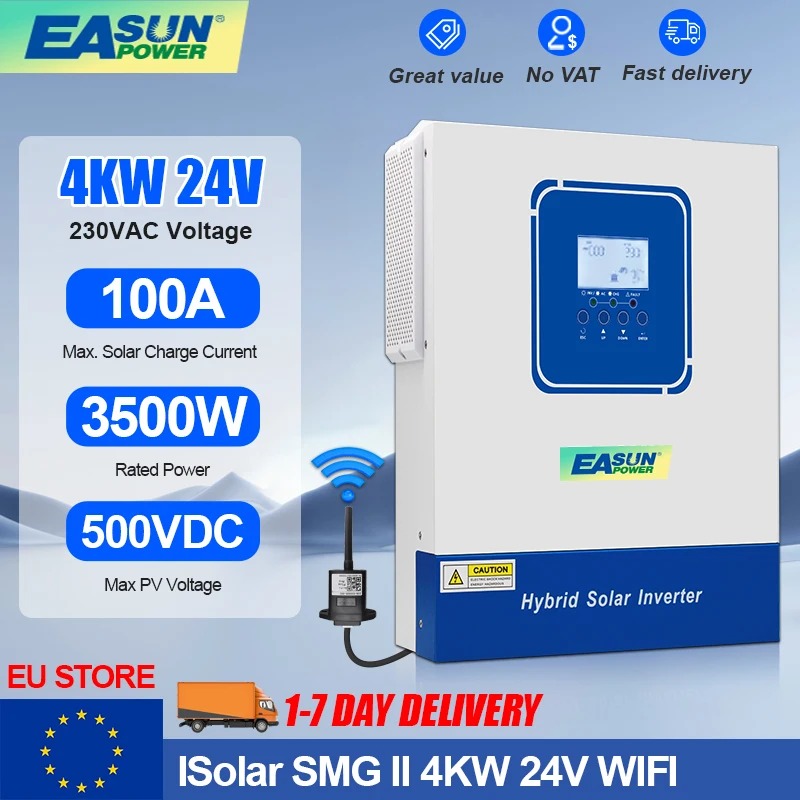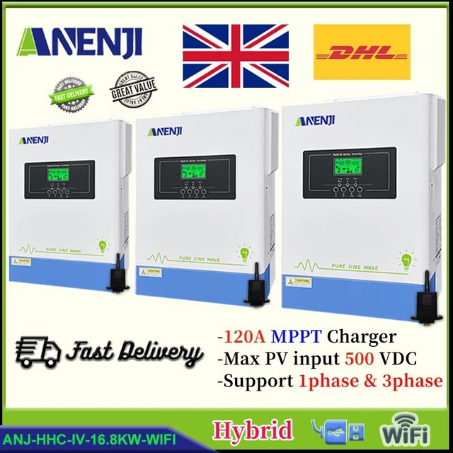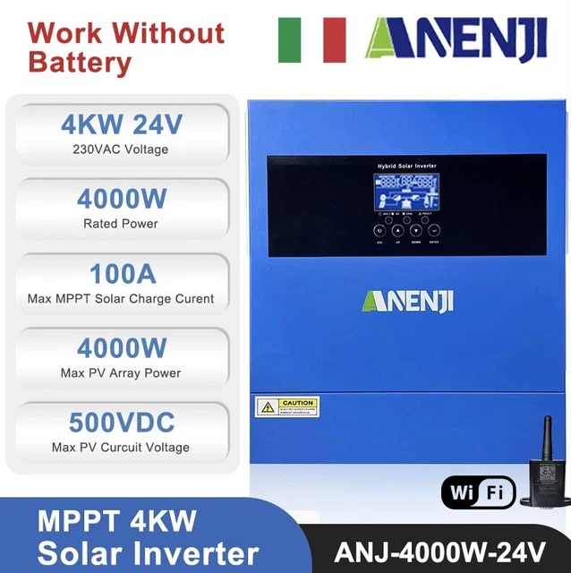 Un onduleur-chargeur hybride tout-en-un pour système solaire autonome (off-grid). Il combine un onduleur (de 4000W, 6200W ou 11000W selon modèle), un régulateur solaire MPPT haute performance (60A, 100A, 120A ou 160A), et un chargeur de batterie à partir du secteur (230V). Compatible avec batteries 12V, 24V ou 48V. Il génère une onde sinusoïdale pure (donc safe pour les appareils électroniques sensibles), avec un rendement de 94%. Gestion via WiFi pour surveiller les performances à distance. Parfait pour une maison, un van aménagé, un chalet, ou un site isolé. Fabriqué en Chine par ANENJI, mais avec des specs pro. C'est du neuf, dans son emballage d'origine. Si vous voulez passer à l'énergie solaire avec un système fiable et intégré, cet onduleur est une solution complète. Vérifiez l'annonce pour choisir la puissance adaptée à vos besoins.