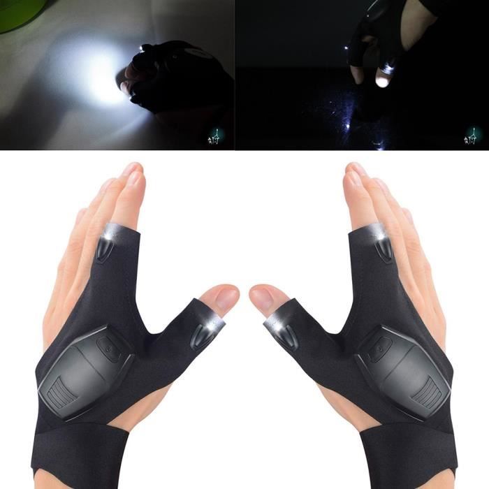 Pêcher, camper ou bricoler dans le noir devient beaucoup plus facile avec ces gants équipés de lampes LED ! Chaque gant possède une petite lampe de poche intégrée, orientable, qui éclaire directement là où vos mains travaillent, libérant vos mains. Ils sont sans doigts (fingerless) au niveau des index et pouces, ce qui permet une grande dextérité pour manipuler des hameçons, des nœuds ou un smartphone (les bouts des doigts sont compatibles écran tactile). En polyester respirant et élastique, avec une sangle réglable au poignet. Couleur noire, taille unique. Marque Chial Star. Ils sont vendus neufs, mais sans leur emballage d'origine ('Neuf sans emballage'). Parfaits pour la pêche de nuit, le camping, la randonnée, le vélo ou même pour certaines réparations de voiture. Une idée de cadeau pratique pour tout amateur de plein air !